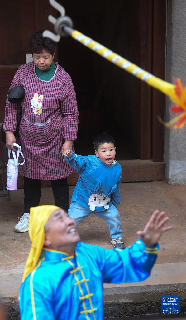 2月4日,在安华镇丰江周村的宗祠,小朋友在观看响叉排练。