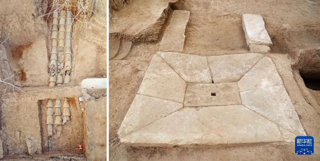 拼版照片:山东青岛市琅琊台战国秦汉时期遗址山顶建筑基址发掘出土的排水设施(资料照片)。