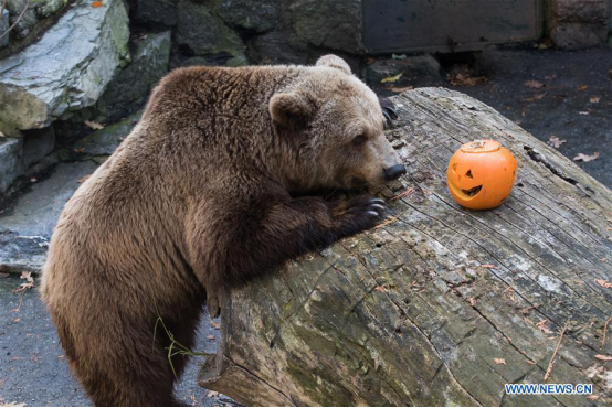 A bear looks at a pumpkin during Halloween celebrations at a zoo in Zagreb, Croatia, on Oct. 28, 2017. (Xinhua/Davor Puklavec)