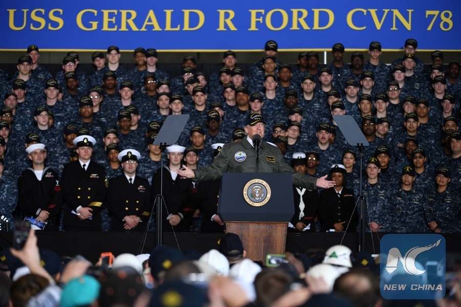 File Photo: U.S. President Donald Trump delivers remarks aboard the pre-commissioned U.S. Navy aircraft carrier Gerald R. Ford in Newport News, Virginia, the United States, March 2, 2017. (Xinhua/Yin Bogu)