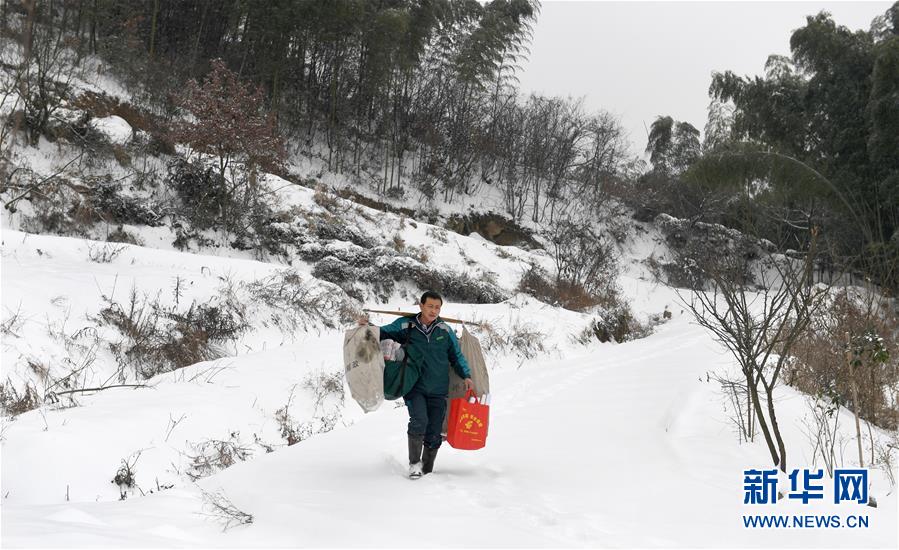 Postman Gu Mingzhou walks along a mountain path, carrying on his shoulders mails to be delivered to local people in Jinzhai County, east China’s Anhui Province, Jan 26, 2018. (Xinhua/Chen Li)