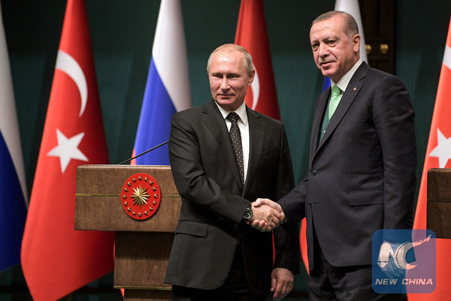 (File photo)Turkish President Recep Tayyip Erdogan (R) shake hands with Russian President Vladimir Putin after their joint press conference at the Presidential Complex in Ankara on December 11, 2017. (AFP photo)