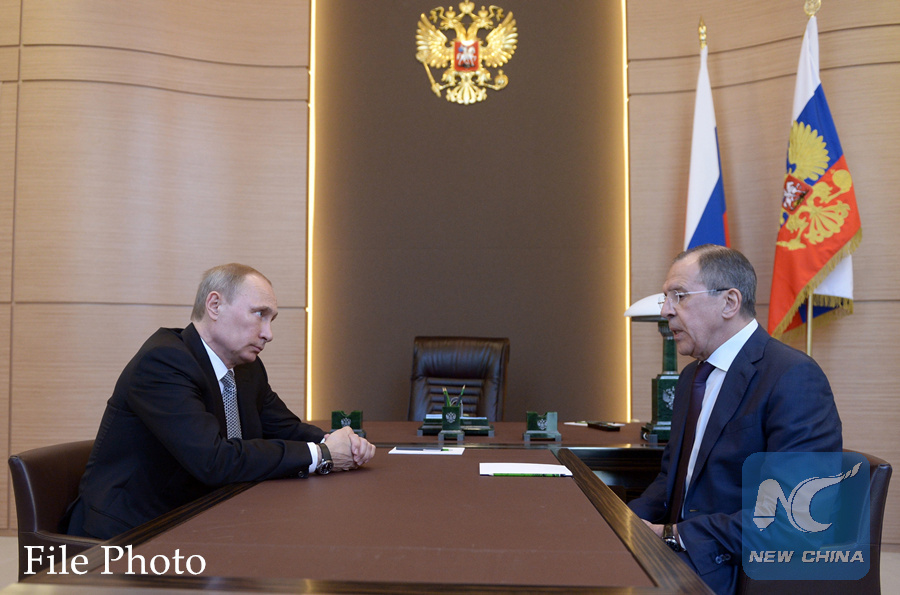 Russian President Vladimir Putin, left listens to Foreign Minister Sergey Lavrov, right, during their meeting at the Bocharov Ruchei residence in Sochi, southern Russia, Monday, March 10, 2014. (Xinhua/AP)