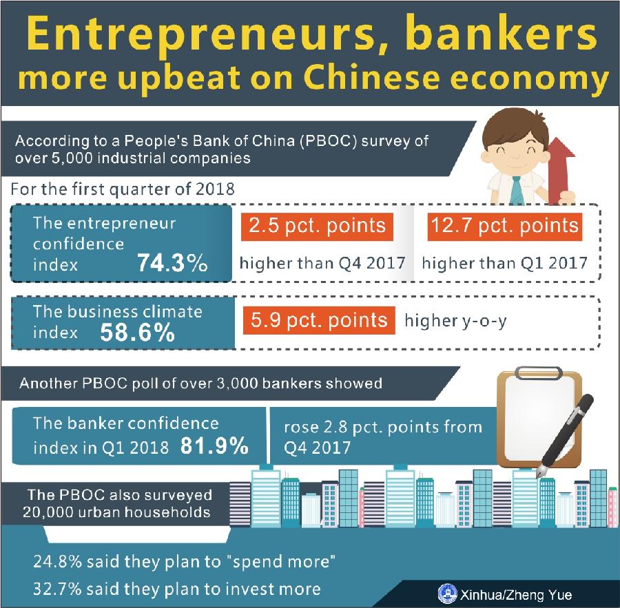 The graphics shows Chinese entrepreneurs and bankers were more confident about Chinese economy in the first quarter of 2018 than the previous quarter, central bank surveys showed on March 15, 2018. (Xinhua/Zheng Yue)