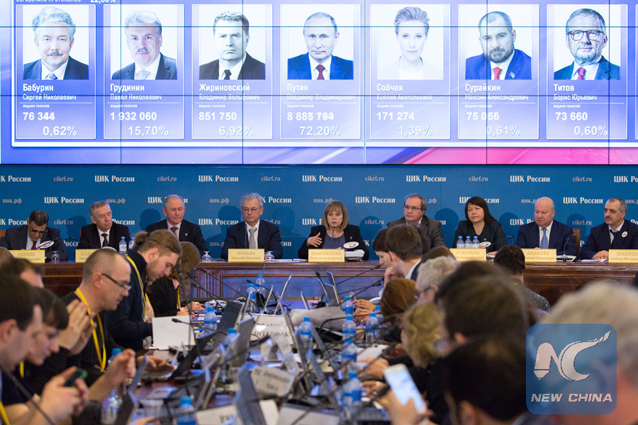 The head of the Russian Central Election Commission Ella Pamfilova (C) speaks during a press conference in Moscow, Russia, on March 18, 2018. (Xinhua/Bai Xueqi)