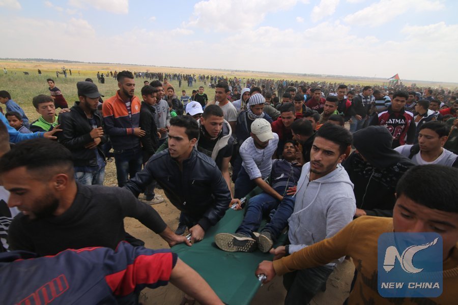 A wounded Palestinian is evacuated during clashes with Israeli troops near the Gaza-Israel border in the southern Gaza Strip City of Khan Younis, on March 30, 2018. (Xinhua/Khaled Omar)