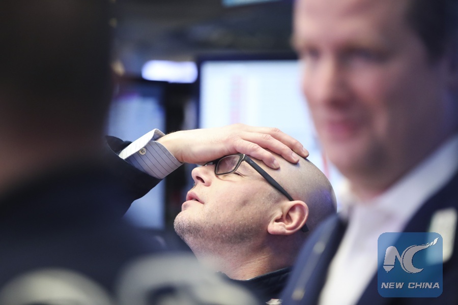 A trader has a rest after market closing at the New York Stock Exchange in New York, the United States, on March 22, 2018. U.S. stocks ended lower on Thursday, with the Dow plunging over 700 points, after U.S. President Donald Trump announced plans to impose tariff on imported products from China. (Xinhua/Wang Ying)