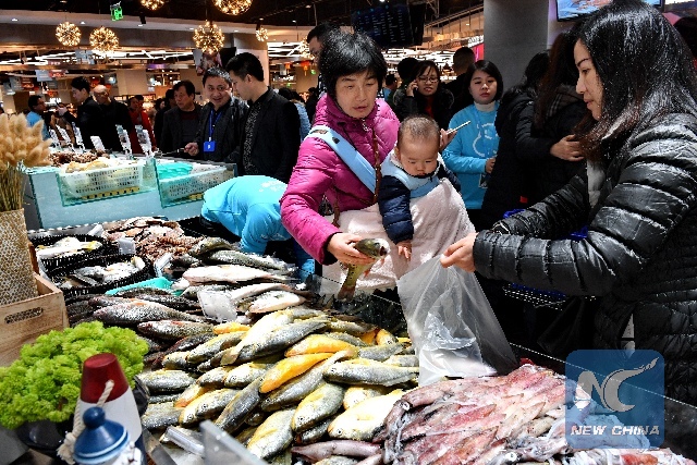 Residents buy seafood at a supermarket in Fuzhou, capital of southeast China's Fujian Province, Feb. 8, 2018. (Xinhua/Zhang Guojun)