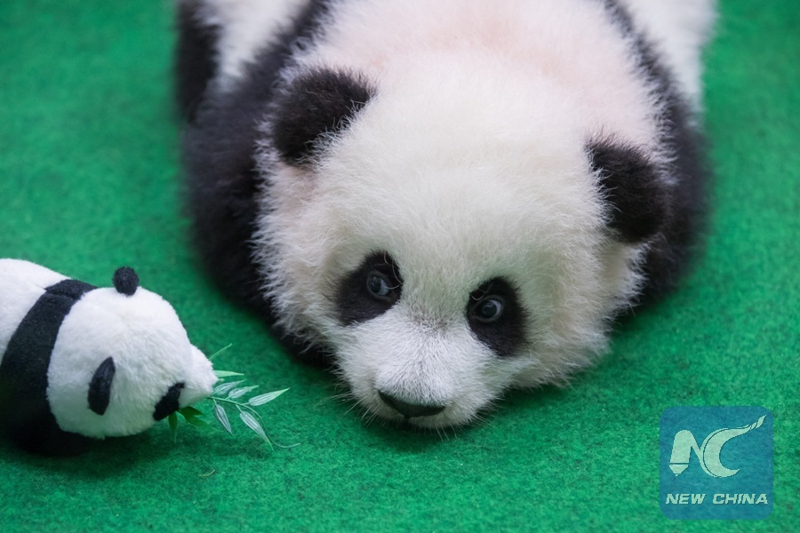 A giant panda cub makes the first public appearance at the Malaysian national zoo near Kuala Lumpur May 26, 2018. (Xinhua/Zhu Wei)