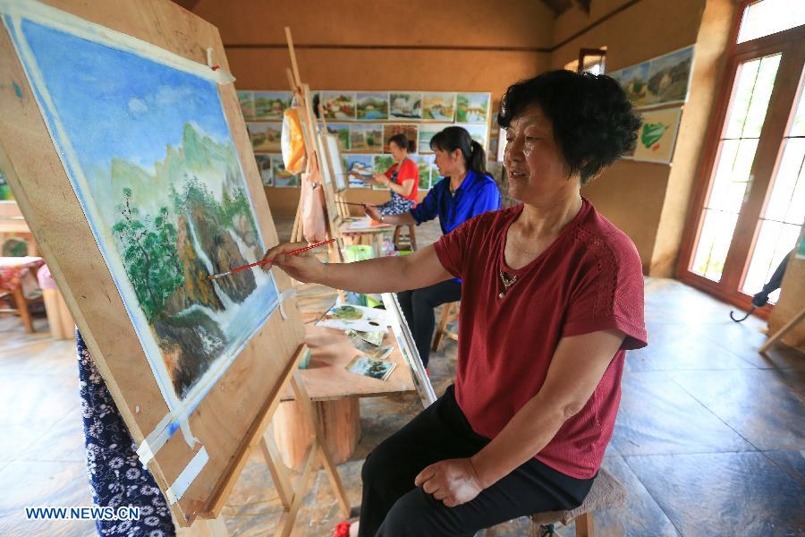 Song Limai (front) paints at a studio in the Muyun'an community of Rongcheng City,east China's Shandong Province, July 5, 2018. The Muyun'an community is famous for painting and is dedicated to boosting tourism based on cultural heritages. (Xinhua/Wang Nan)
