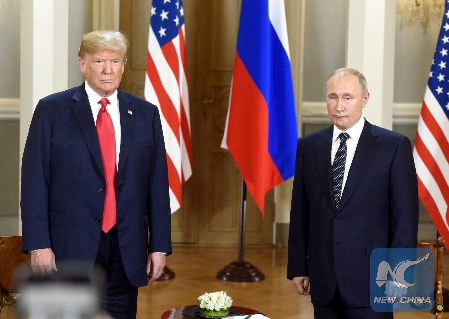 U.S. President Donald Trump (L) meets with his Russian counterpart Vladimir Putin in Helsinki, Finland, on July 16, 2018. (Xinhua/Lehtikuva/Heikki Saukkomaa)