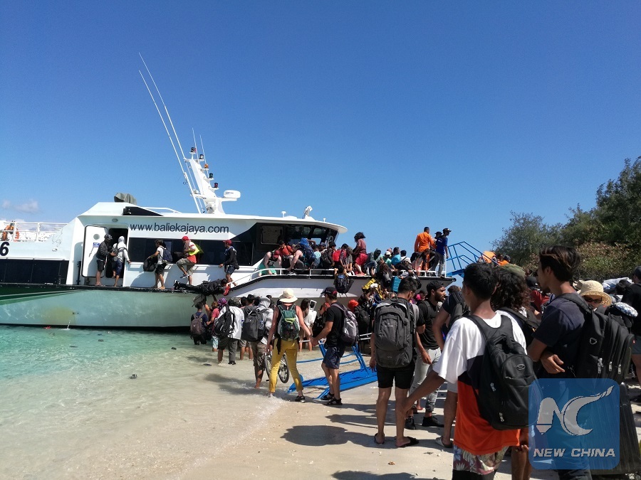 Visitors evacuate from Gili Trawangan near Lombok Island in Central Indonesia, Aug. 6, 2018.m (Xinhua/Liang Fangfang)