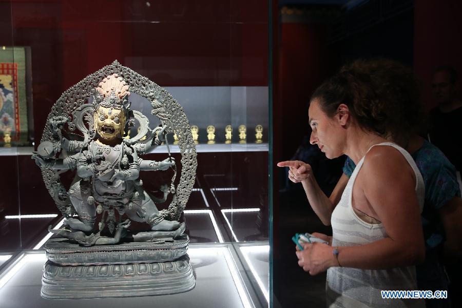 A bronze statuette of Mahakala is seen at the exhibition titled "From the Forbidden City: The imperial apartments of Qianlong" at the Acropolis Museum in Athens, Greece, on Sept. 12, 2018. A rare exhibition on China's Emperor Qianlong is going on display at the Acropolis Museum, with exquisite artifacts that will be presented for the first time to the public from Sept. 15 to Feb. 14, 2019, the museum said on Wednesday. (Xinhua/Marios Lolos)