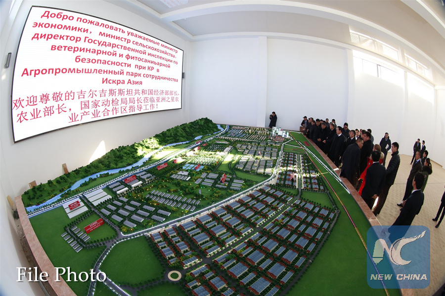 People visit the sand table of the Iskra Asia agro-industrial cooperation zone at the village of Iskra in Chuy valley, Kyrgyzstan, Jan. 6, 2017. (Xinhua/Roman)