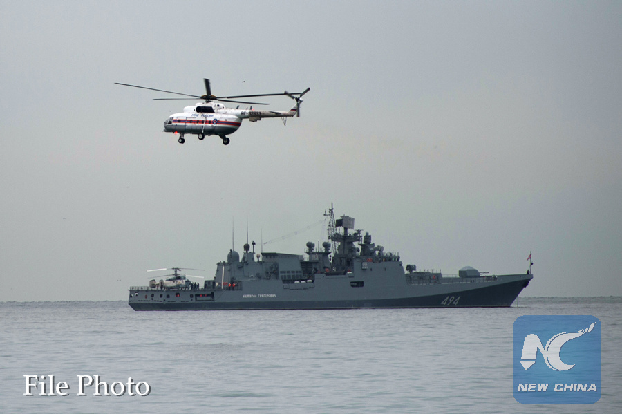 Photo taken on Dec. 27, 2016 shows a navy ship and a helicopter taking part in a rescue operation on the Black Sea coast at the crash site of Russian Defense Ministry's Tu-154 aircraft near Sochi, Russia. (Xinhua/Sputnik)