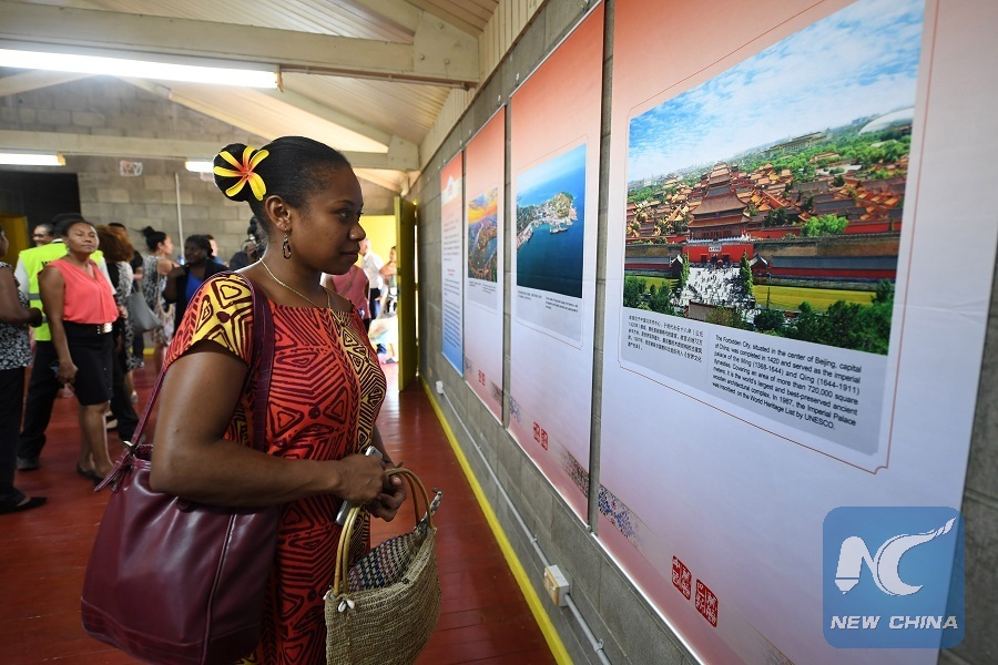 People visit a photo exhibition co-organized by China and Papua New Guinea (PNG) displaying 100 pictures on the two countries' landscapes, cultures and society, in Port Moresby, Papua New Guinea, on Nov. 12, 2018. (Xinhua/Lui Siu Wai)