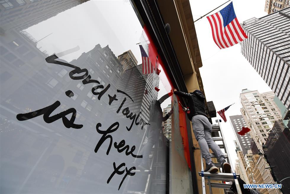 A worker cleans up window posters at the flagship store of the famous department store chain Lord & Taylor on Fifth avenue in Manhattan, New York, the United States, Jan. 2, 2019. The famous department store chain Lord & Taylor officially closed its flagship store on Fifth avenue in Manhattan, New York City. (Xinhua/Li Rui)?