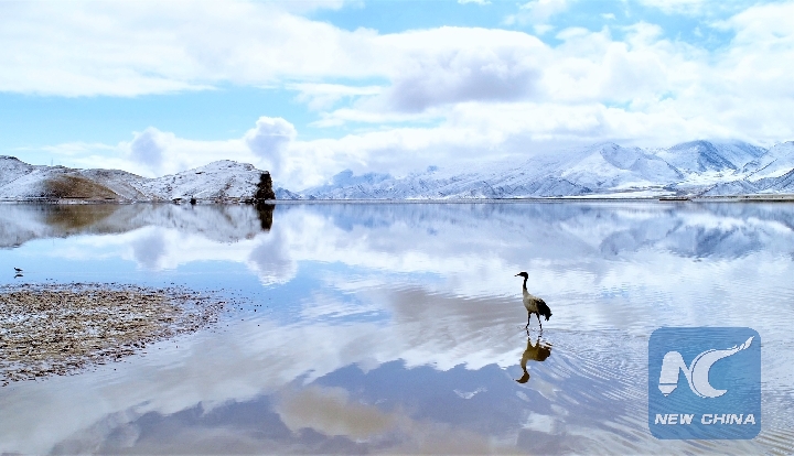 Aerial photo taken on March 10, 2018 shows a black-necked crane in Linzhou County, southwest China's Tibet Autonomous Region. (Xinhua/Purbu Zhaxi)