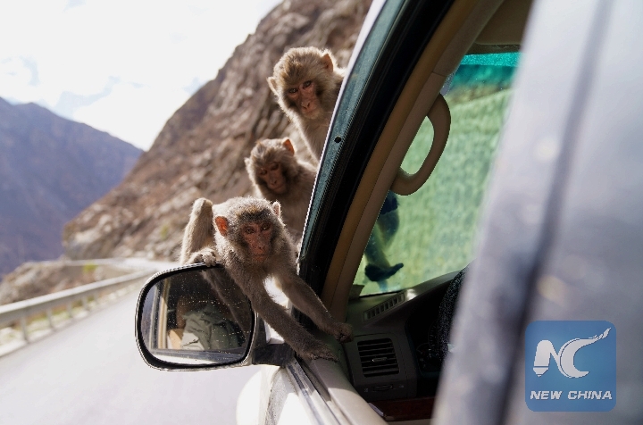 Wild monkeys cling to a car along the Provincial Highway No. 306 at Gyaca County, southwest China's Tibet Autonomous Region, April 23, 2018. (Xinhua/Jigme Dorge)