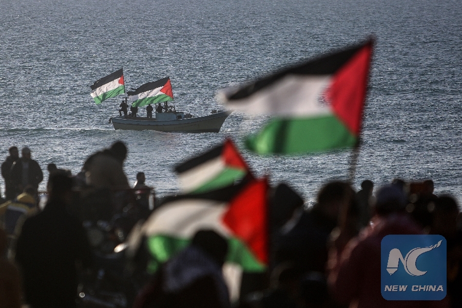Palestinian protesters gather on the beach and on boats as they clash with Israeli troops near the border with Israel, in northern Gaza Strip, on Jan. 29, 2019. (Xinhua/Stringer)