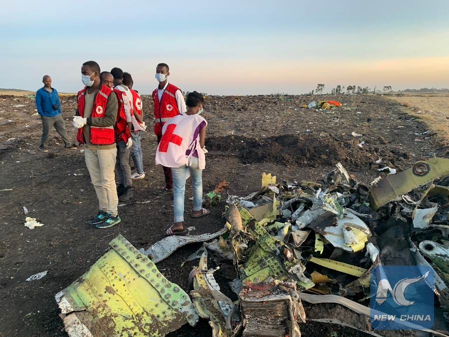 Rescuers work beside the wreckage of an Ethiopian Airlines' aircraft at the crash site, some 50 km east of Addis Ababa, capital of Ethiopia, on March 10, 2019. (Xinhua/Wang Shoubao)