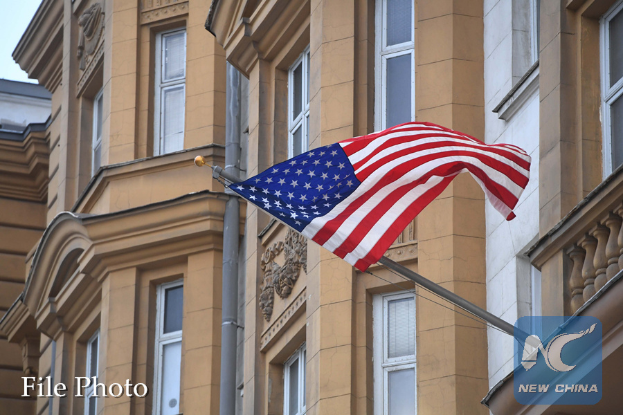 Photo taken on Dec. 30, 2016 shows the U.S. national flag on the U.S. Embassy building in Moscow, Russia. Russian President Vladimir Putin said Friday that Russia will not expel anyone in response to latest U.S. sanctions. (Xinhua/Sputnik)