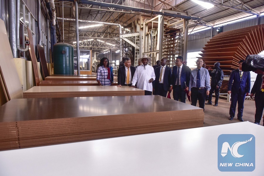 File photo Ugandan President Yoweri Museveni (3rd, L) visits a factory in the Tian Tang Industrial Park in Mukono, Uganda, March 9, 2019. (Xinhua)