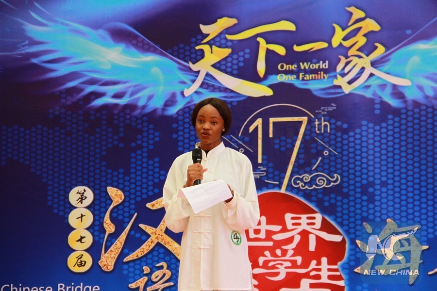 A student takes part in the 17th Chinese-Bridge Proficiency Competition for College students in Windhoek, capital of Namibia, April 26, 2018. The competition was organized by the Confucius Institute in Namibia. (Xinhua/Wu Changwei)