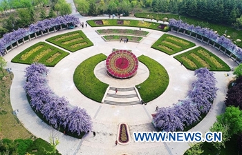 Aerial photo taken on April 30, 2019 shows the scenery of wistaria at a scenic area in Jiaozhou City, east China's Shandong Province. (Xinhua/Wang Zhaomai)