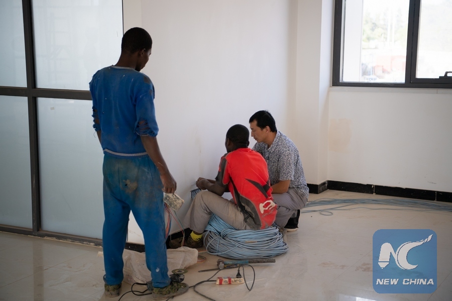 Photo taken on Nov.1, 2018 shows Chinese technician (R) and Rwandan employees working in the the Administrative Office Complex of Rwanda in Kigali, capital city of Rwanda. (Xinhua/Li Yan)