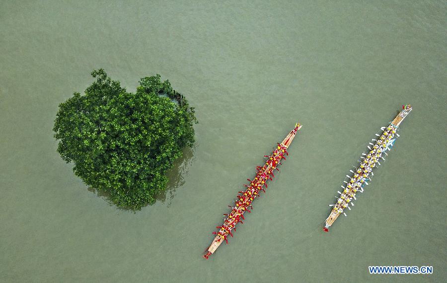Aerial photo taken on June 14, 2018 shows people participating in a dragon boat race to greet the Dragon Boat Festival in Wenzhou City, east China's Zhejiang Province. China will hold the Conference on Dialogue of Asian Civilizations starting from May 15. Under the theme of "exchanges and mutual learning among Asian civilizations and a community with a shared future," the conference includes an opening ceremony and sub-forums. (Xinhua/Su Qiaojiang)