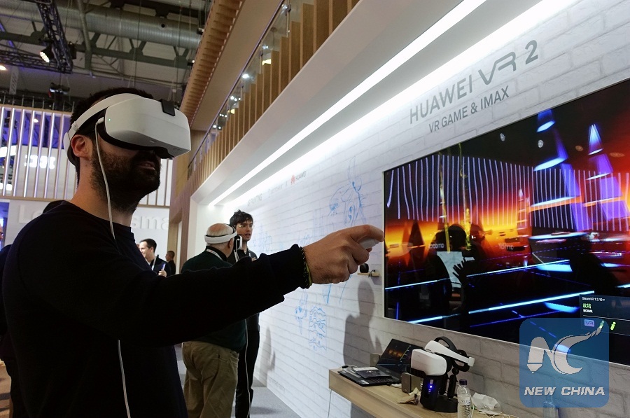 A man plays a VR game of HUAWEI at the 2019 Mobile World Congress (MWC) inBarcelona, Spain, Feb. 28, 2019. (Xinhua/Guo Qiuda)
