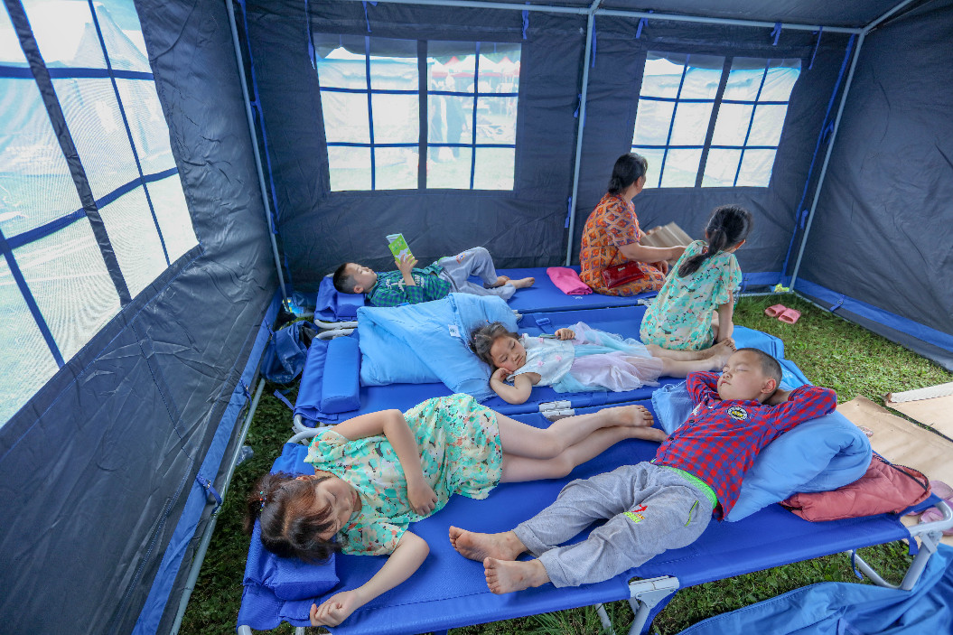 People rest in a tent in the quake-stricken Changning County, southwest China's Sichuan Province. (Xinhua/Liu Changsong)