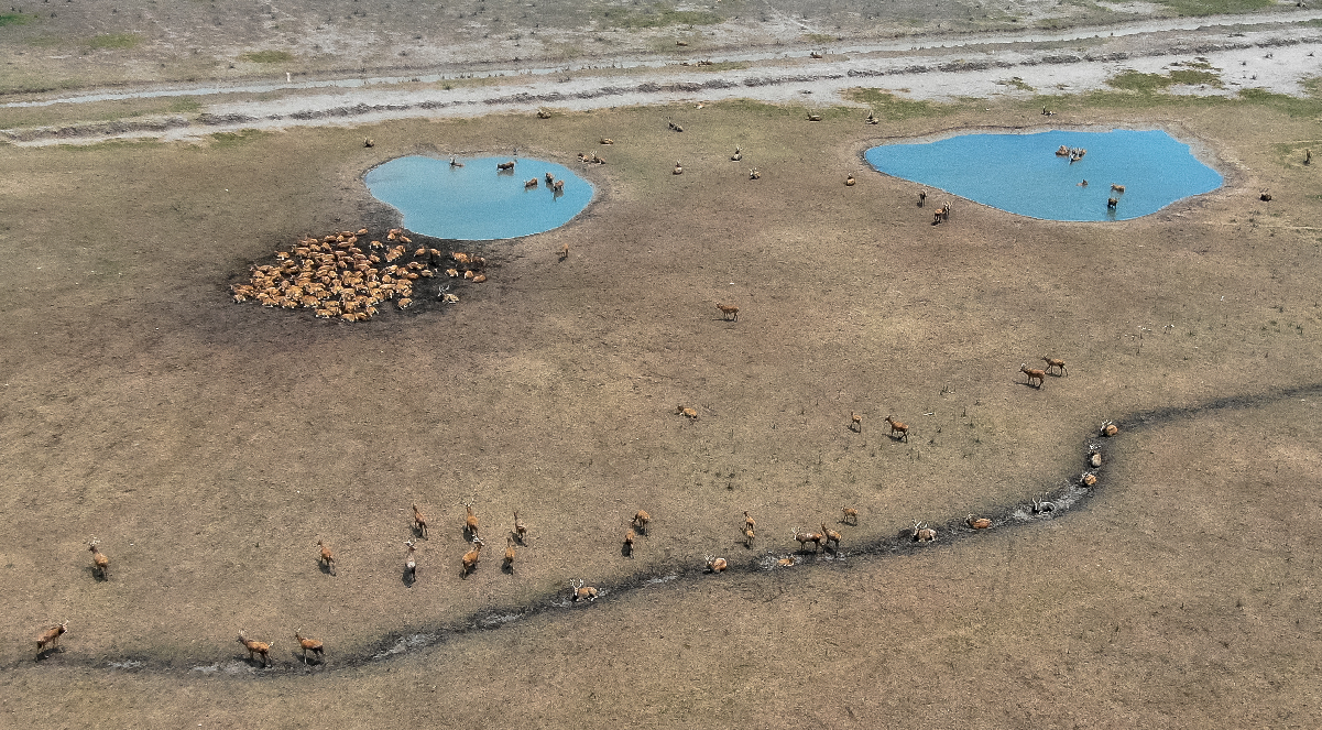 Aerial photo taken on June 28, 2019 shows milu deer gathering around a pond in Dafeng Milu National Nature Reserve in east China's Jiangsu Province. (Xinhua/Li Xiang)