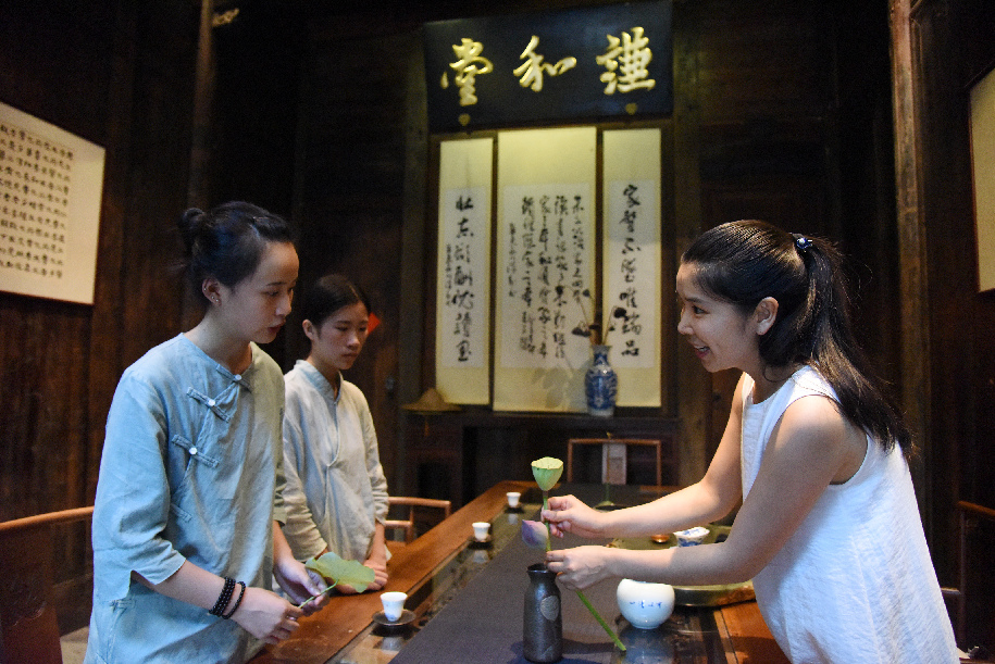 A tourist communicates on flower arranging, or ikebana, with staff members at a hotel of Tangcun Village in Wuyuan County, east China's Jiangxi Province, June 27, 2019. (Xinhua/Zhang Ruiqi)