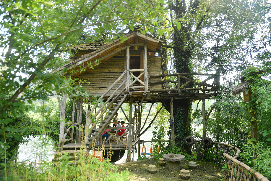 Tourists drink tea at a tree house in Qiukou Township in Wuyuan County, east China's Jiangxi Province, June 30, 2019. (Xinhua/Sun Ruibo)