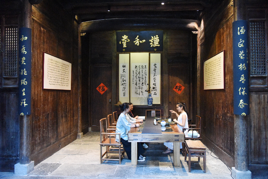 People enjoy tea at a hotel, previously an official's residence in the Qing Dynasty (1644-1911), in Wuyuan County, east China's Jiangxi Province, June 27, 2019. (Xinhua/Sun Ruibo)