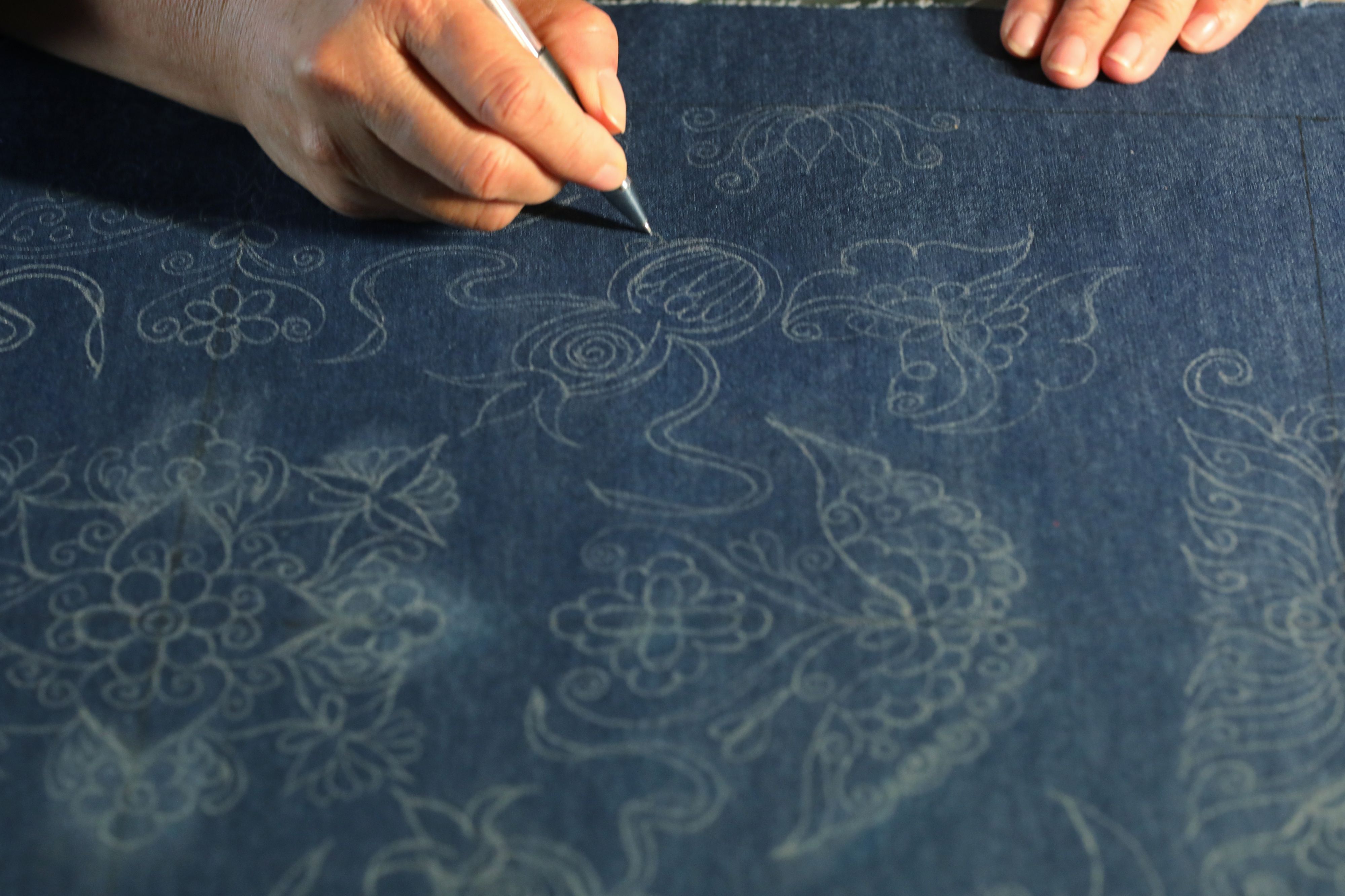 Wei Taohua is pictured in this inverted image while drawing needlework sketches for the traditional horse tail embroidery. (Xinhua/Ou Dongqu)