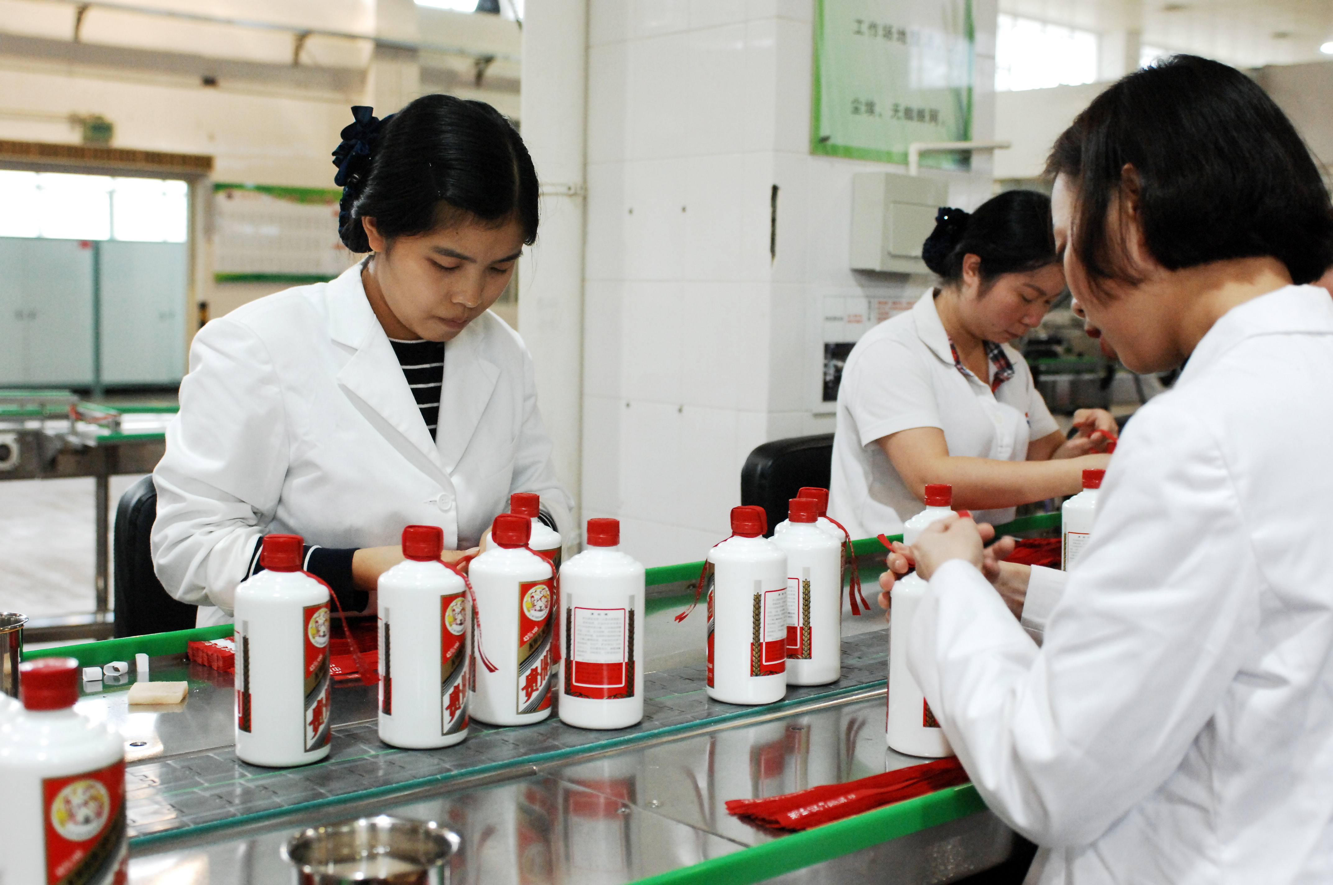Workers package bottles of liquor at a workshop of Kweichow Moutai in Maotai town in the city of Renhuai in southwest China's Guizhou Province, Oct. 23, 2018. (Xinhua/Lin Liping)
