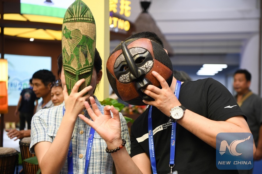 Visitors try masks at the booth of the Republic of Ghana during the China-Africa Economic and Trade Expo in Changsha, central China's Hunan Province, June 28, 2019. (Xinhua/Xue Yuge)