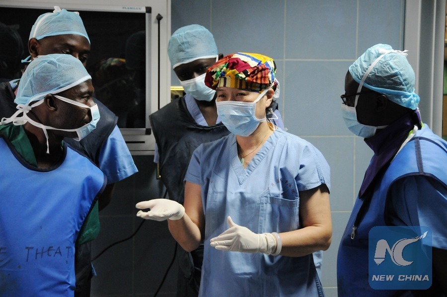 Photo taken on July 13, 2016 shows Chinese surgeon Lin Chunying (2nd R) explaining the usage of temporary pacemaker to Ghanaian medical staff at Komfo Anokye Teaching Hospital (KATH) in Kumasi, Ghana. (Xinhua/Lin Xiaowei)