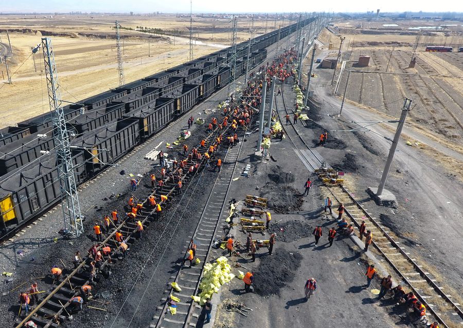 Constructors work on the Daqin Railway in Datong, north China's Shanxi Province. (Xinhua/Cao Yang)
