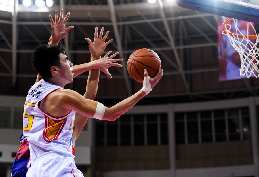 Lu Yiwen (front) of Shenzhen lays up during the match against Tianjin in the Chinese Basketball Association league on November 10, 2018. (Xinhua/Mao Siqian)
