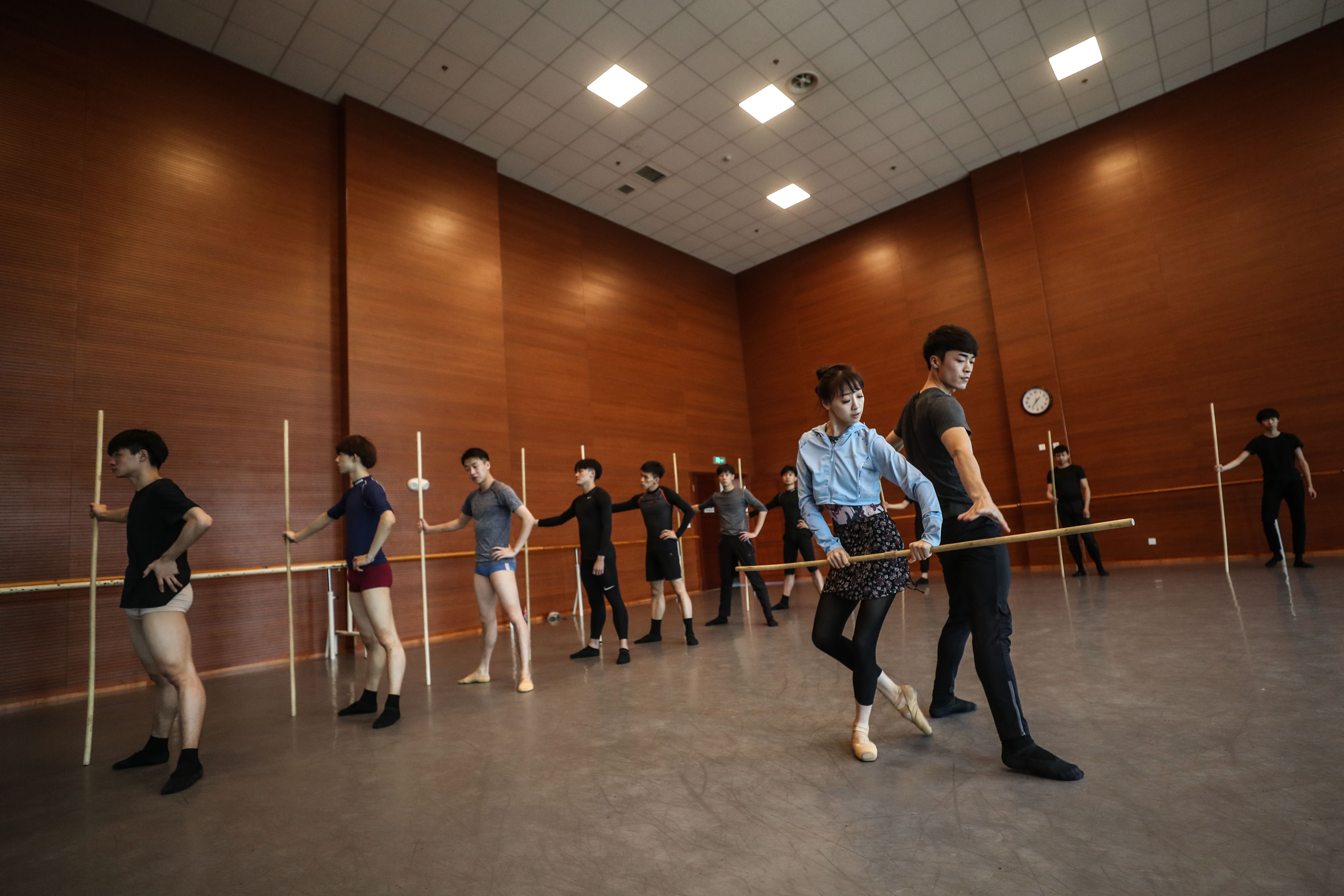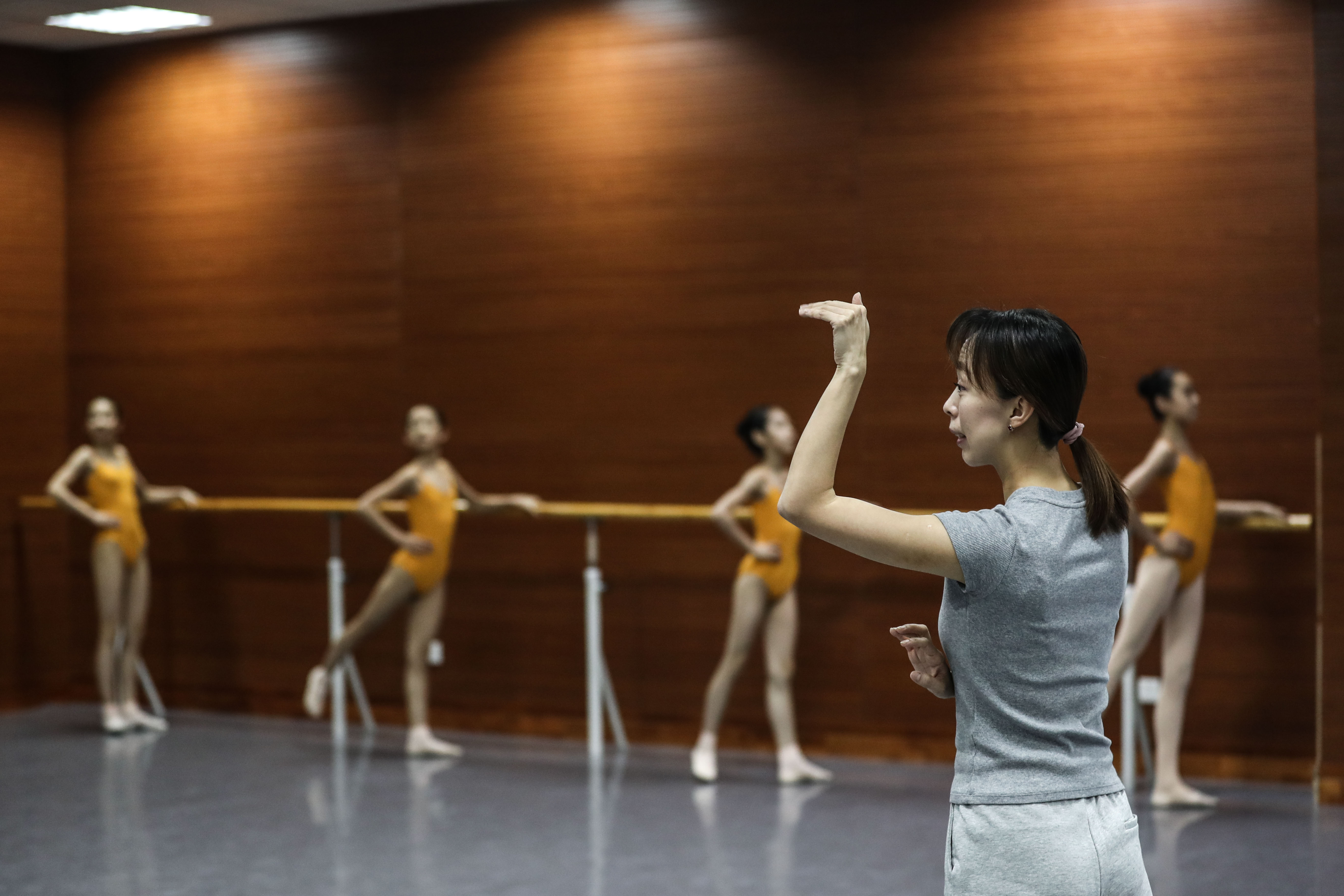Zhang Mengni, a teacher of the affiliated school of the Liaoning Ballet of China, instructs the first grade students during a basic training course of ballet in Shenyang, northeast China's Liaoning Province, April 12, 2019. (Xinhua/Pan Yulong)