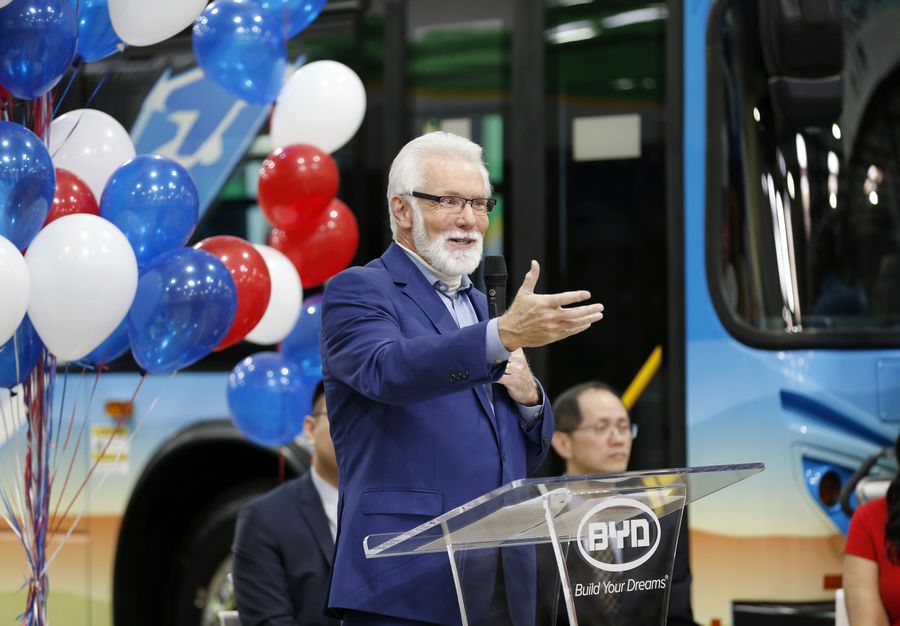 Lancaster Mayor R. Rex Parris delivers a speech at the 300th BYD electric bus offline ceremony in Lancaster, Los Angeles County, the United States, April 3, 2019. (Xinhua/Li Ying)