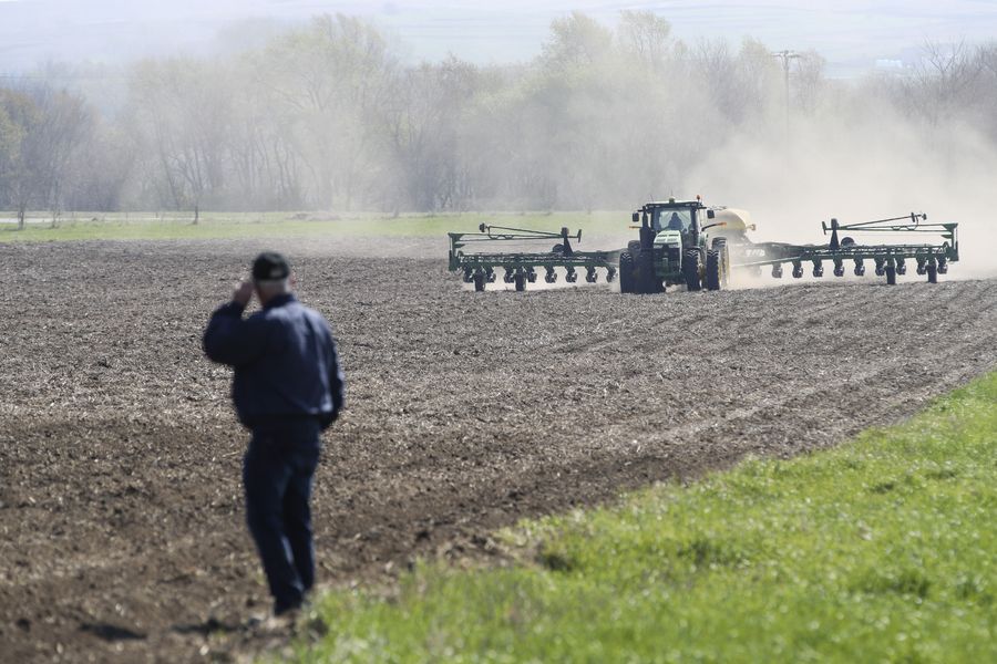 Bill Pellett watches as his son Bret plants corn with a planter machine at their family farm in Atlantic of Cass county, Iowa, the United States, April 24, 2019.