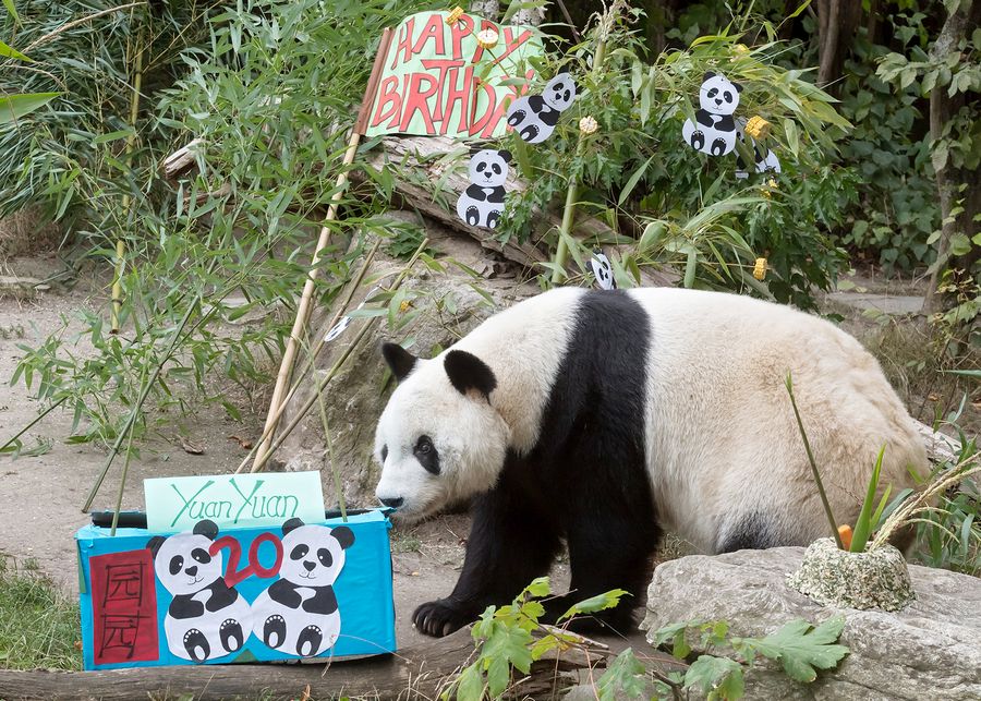 Giant Panda Yuan Yuan prepares to eat his birthday meal in the Schonbrunn Zoo in Vienna, Austria, Aug. 21, 2019. (Photo by Daniel Zupanc/Xinhua)