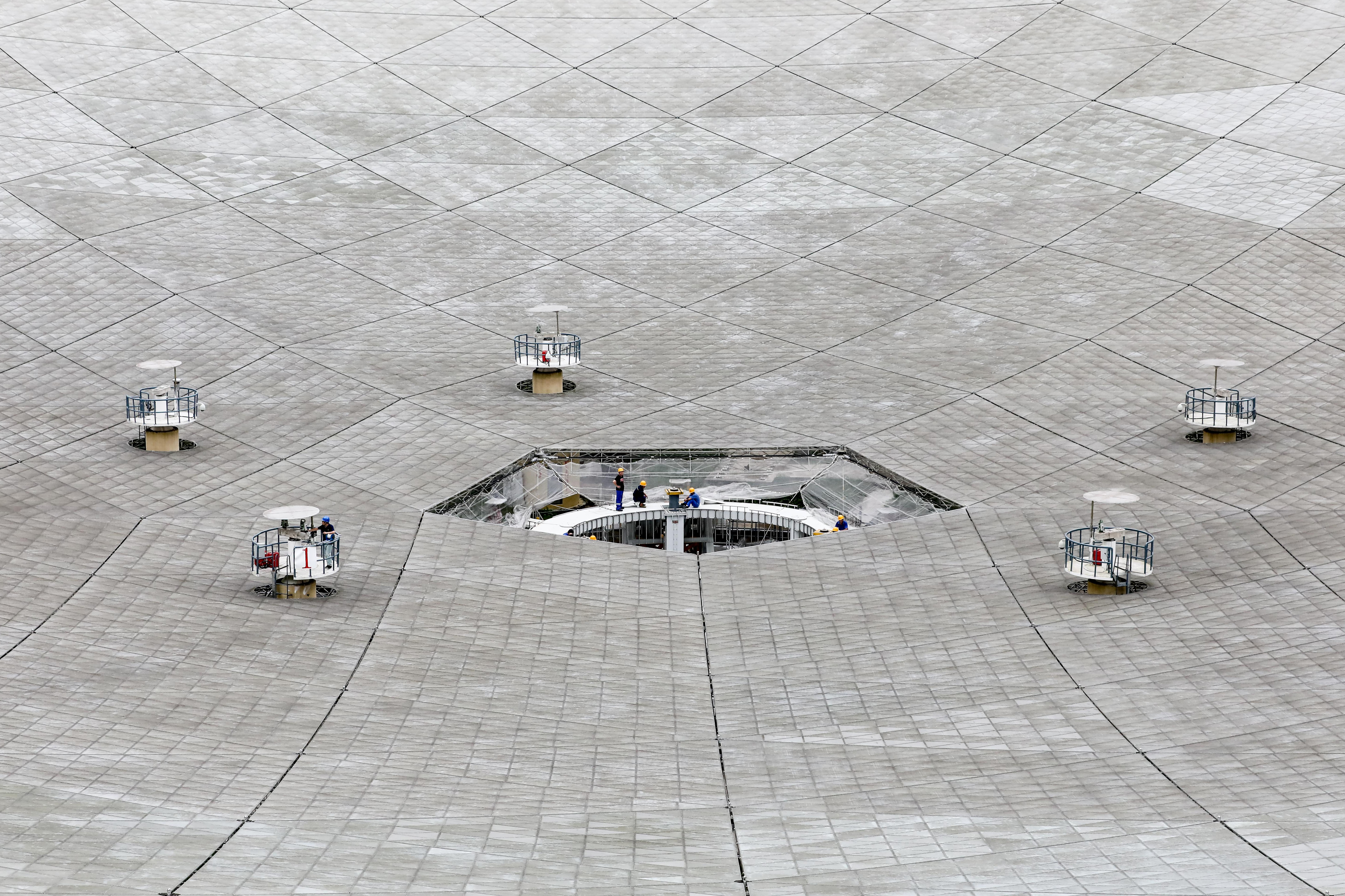 Staff members conduct maintenance operation for China's Five-hundred-meter Aperture Spherical radio Telescope (FAST) in southwest China's Guizhou Province, Aug. 28, 2019.(Xinhua/Ou Dongqu)