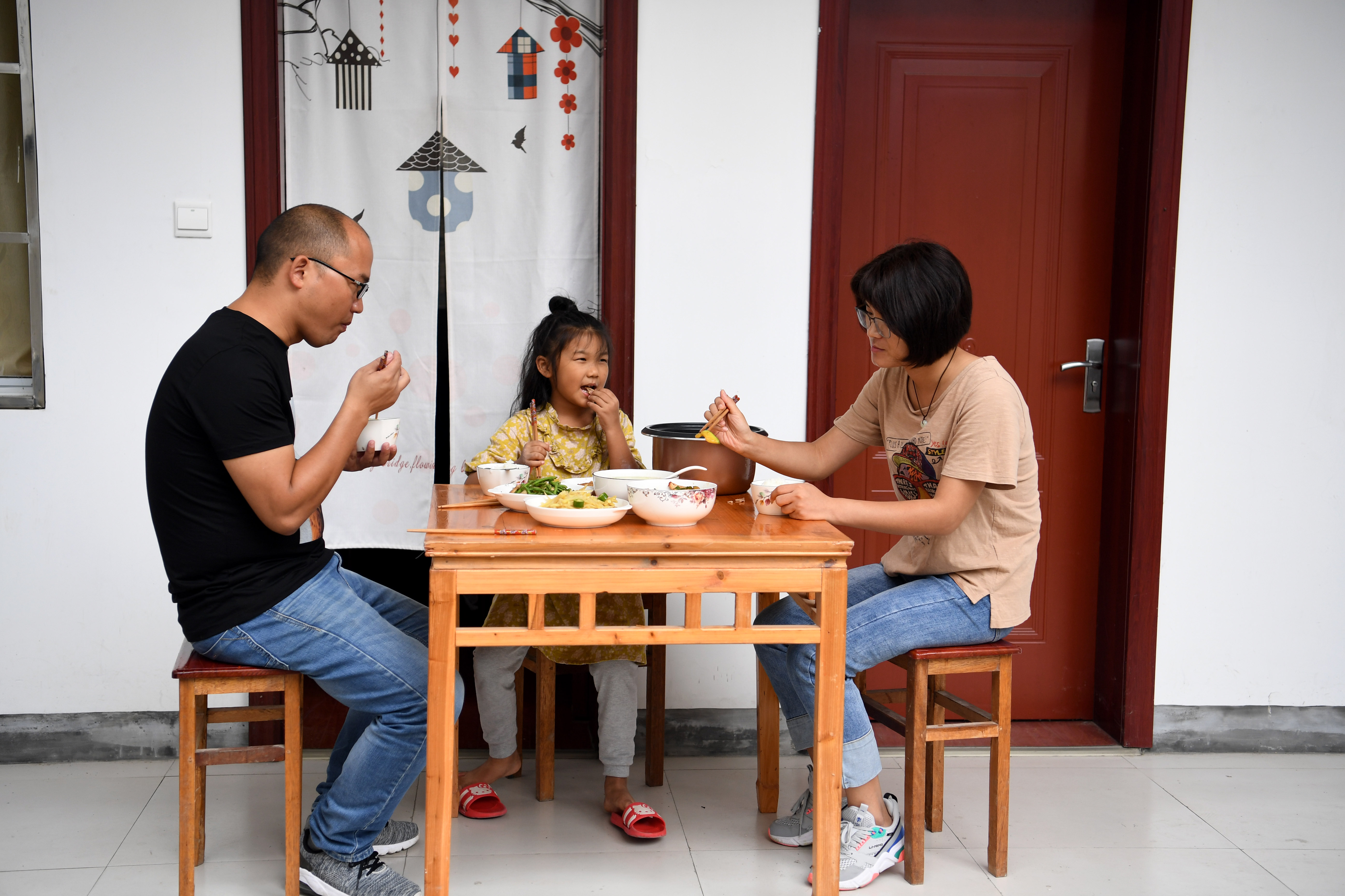 Zhang Qingyu has lunch with her parents in their dormitory in Huangjian Township of east China's Anhui Province, Aug. 31, 2019. (Xinhua/Liu Junxi)