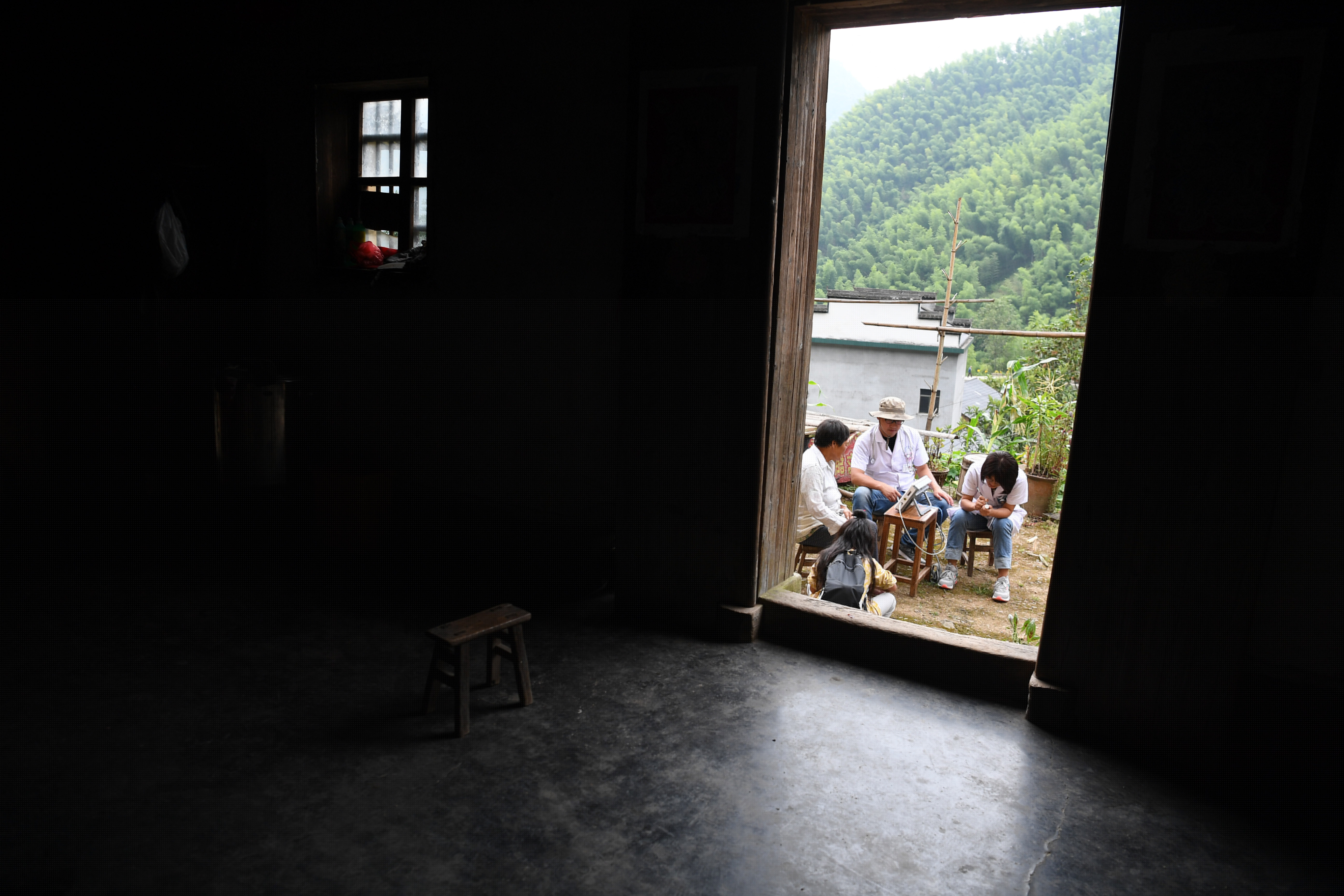 Zhang Qinyu reads as her mother Xu Xiaochan diagnoses for a villager in Qingxi Village, Huangjian Township of east China's Anhui Province, Aug. 31, 2019.(Xinhua/Liu Junxi)